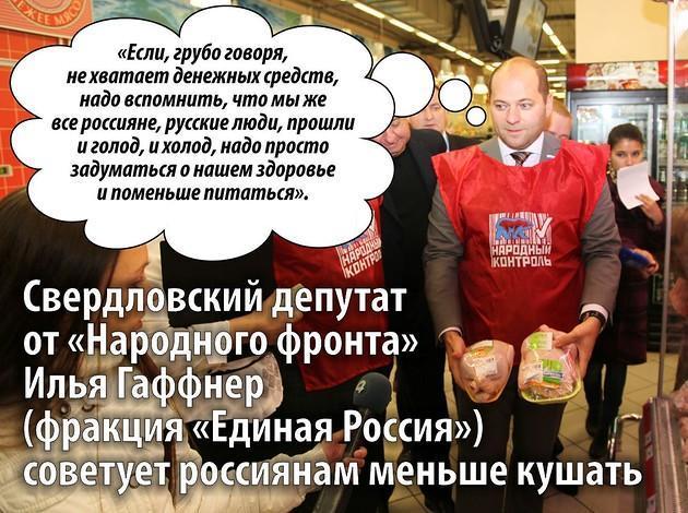 Прославившийся советом (http://www.apn-spb.ru/opinions/article19962.htm) дорогим россиянам поменьше есть свердловский депутат от "Единой России" Илья Гаффнер полон решимости продолжить политическую карьеру. Он объявил о своей победе на праймериз и теперь станет кандидатом от партии на грядущих выборах. Именно такой кандидат "медведям" и нужен: владелец признанного банкротом (http://vedomosti-ural.ru/news/50184/?ya_rss=1) ООО "Шиловское" и отец воришки, попавшегося (http://www.uralweb.ru/news/society/454973.html) на краже колёс с чужого автомобиля.