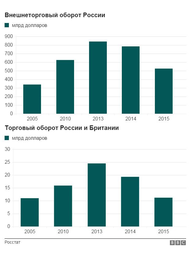 По данным Росстата, за 2014 год товарооборот двух стран снизился на 21,5% до 19,3 млрд долларов. За 2015 год объемы торговли упали на 41,9% до 11,2 млрд долларов. Таким образом, за 2014-2015 годы оборот снизился на 13,4 млрд долларов.