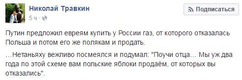 «А евреи тут при чем?» — удивился Путин. И тут же сам предложил вариант: «Кто-нибудь да купит! Может, израильтяне купят, и будут продавать этот газ Польше». Нетаньяху, услышав это, вежливо рассмеялся. Но предложил другой вариант.