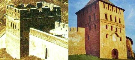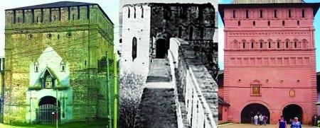 Русские башни: слева – Никольские ворота (Смоленск, фото Погудин-Горский); в центре – северная крепостная стена Никитского монастыря (Переславль-Залесский, 16 в.); справа – башня в Суздале (середина 17 в.).