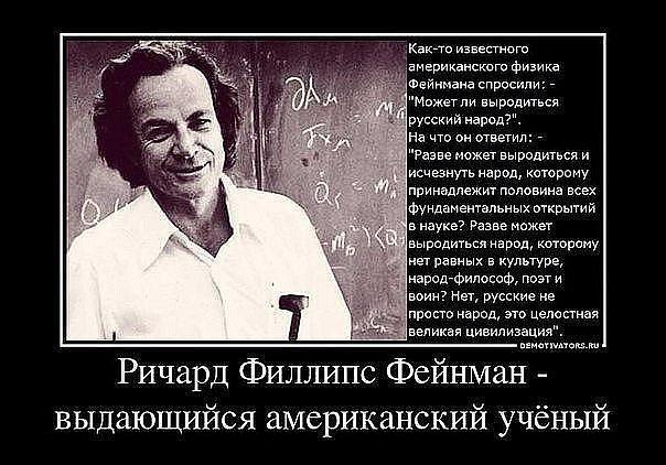 Когда выдающегося американского физика Ричарда Фейнмана спросили, может ли выродиться русский народ, он ответил: «Разве может выродиться и исчезнуть народ, которому принадлежит половина всех фундаментальных открытий в науке? Разве может выродиться народ, которому нет равных в культуре, народ-философ, поэт и воин? Нет, русские не просто народ, это целостная великая цивилизация».