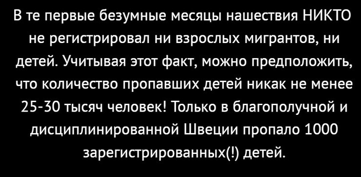 31 января этого года Интерпол ошарашил мир чудовищной цифрой: на территории Европы пропало 10 000 детей-беженцев. Спустя пару месяцев ее уточнили до 12 тысяч. Речь шла только о ЗАРЕГИСТРИРОВАННЫХ(!) детях. А это лишь верхушка айсберга.