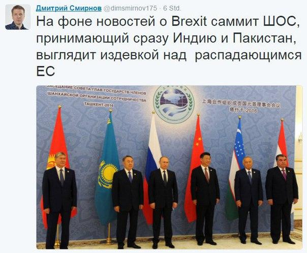 "На самом деле, жаль что Евросоюзу грозит распад, поскольку идея ЕС, принадлежавшая блестящим политическим умам послевоенной Европы, была, безусловно, идеей замечательной и прогрессивной. К сожалению, впоследствии к власти пришли мелкие политические игроки, а не государственные деятели», — пишет Познер на портале pozneronline.ru.