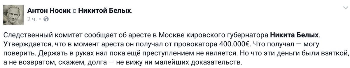 В отличие от либеральных спикеров типа Ксении Лариной, скандально известного журналиста Сотника и массы оппозиционных активистов с мантрой "его подставили, окрасили бокал спецкраской, он не дурак брать в ресторане кэшем", Анатолий Чубайс, Леонид Волков с Навальным, экс-соруководитель СПС Сергей Григоров и т.д. не поверили в версию задержанного с поличным о полученных "деньгах для Кирова".