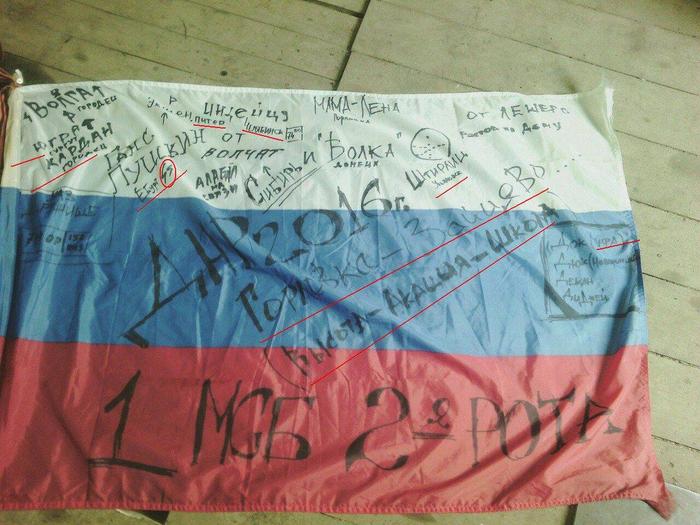 На тряпке террористы указали свои родные места, из которых они прибыли воевать с "хунтой" в 2016 году. Среди них: Ульяновск, Челябинск, Сибирь, Уфа, Ростов на Дону, Питер, Сургут, Городец... Особенно умиляет нацистский знак ваффен-СС, начертанный видимо пламенным "антифашистом" Екатеринбурга.