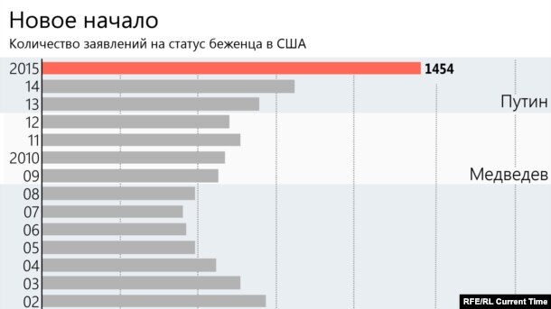В 2014 году граждане России подали 1454 заявок на предоставление убежища в США. Это самая высокая цифра за последние два десятилетия и на 50% больше, чем было подано в 2012 году, когда Владимир Путин вернулся в Кремль после четырехлетнего пребывания на посту премьер-министра.