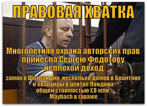 28 июня Таганский районный суд Москвы санкционировал арест делового партнера и кума Никиты Михалкова — генерального директора Российского авторского общества Сергея Федотова. Последние 12 лет он руководил сбором вознаграждений за использование музыкальных произведений. Ему предъявлено обвинение в мошенничестве на сумму более 500 миллионов рублей. Илья РЕЗНИК и другие поэты и композиторы уже давно высказывали недовольство деятельностью Федотова. За время руководства РАО он обзавелся дорогостоящей недвижимостью в России и за рубежом, в том числе старинным замком в Шотландии стоимостью миллион евро. При этом до многих авторов причитающиеся им деньги не доходили.