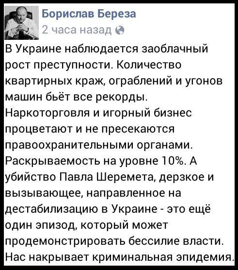 По его мнению, представители криминалитета на Украине будут все больше активизировать свою преступную деятельность. «Граждане Украины, приготовьтесь к войне — начинается беспредел. Вал уголовной преступности захлестнул правоохранительные органы, работать некому.