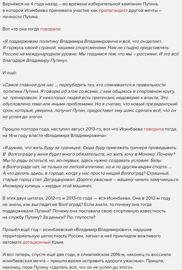 «Уважаемые друзья и СМИ, информация о якобы неподанной мной индивидуальной заявке в IAAF на участие в ОИ в Рио, является ложной. 20 минут назад я получила отрицательный ответ от секретаря IAAF. К сожалению, мне не сделали исключение. До ОИ в Рио меня не допустили. Чуда не произошло. Спасибо вам всем большое за поддержку, огромное спасибо! Не судьба мне выступить в Рио!», — написала Исинбаева в соцсети.