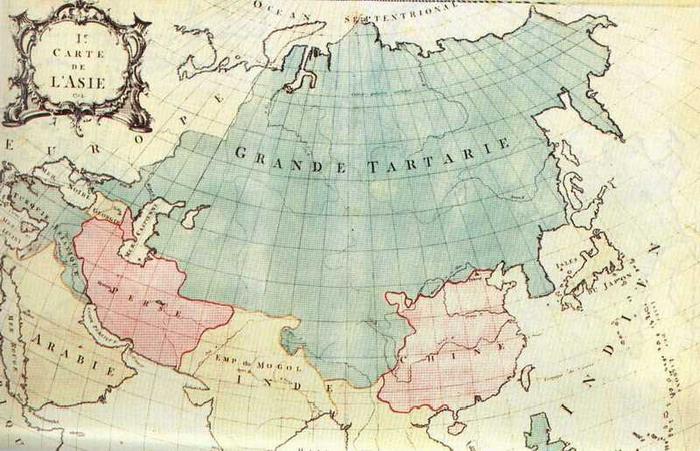 карта 1754 года "I-e Carte de l’Asie". Через всю огромную территорию Российской империи, вплоть до Тихого Океана, включая Монголию, Дальний Восток и т.д., идет надпись крупными буквами: Grande Tartaria, то есть Великая Тартария