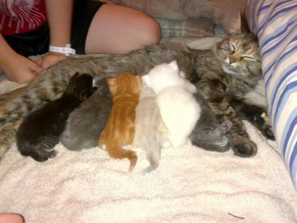 Белая кошка - "девочка", не рожала и с котами не гуляла. Но восприняла котенка как родного. Что интересно - у нее даже появилось молоко. Вот уже третий год подкармливает приемного сынка
