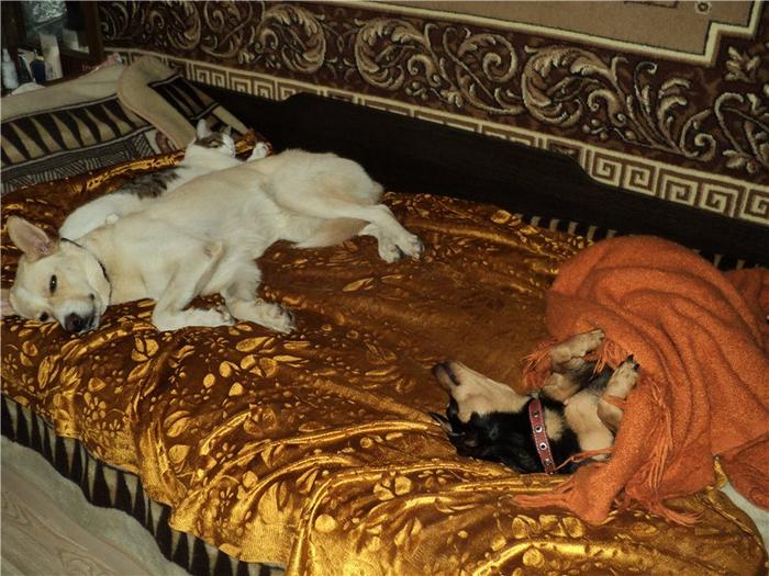 Сейчас спасает только то, что стоит жара и им на кровати тоже жарко. Но ночью точно двое спят на мне или возле. Один кот Семка и одна собака малякала- Мулька. Помесь таксы с пинчером... Когда холодно, Мулька из одеяла делает себе кокон и так спит. Чем дышит - не знаю....