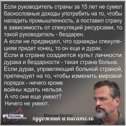 Менталитет русского народа своеобразный, и непредсказуемый. Вглядитесь в название улиц, скверов, площадей. Монумент Ельцину под охраной. Возведен мемориальный центр.Это вы возвели руками своих избранников! Недавно были любимы, а ныне враги: Горбачев. Б.Н.Ельцин, Гайдар.! Вы же за них голосовали? Почему же часто звучит недовольство властью? «За что боролись, на то и напоролись!» Как - то, еще в период Горби, один "сиделец" из мордовских лагерей в беседе о выборах, высказал мнение: "Чтобы этот народ поумнел и знал за кого голосует, нужно 8 лет его кормить опилками там, где я отсидел, и отпахал за него". Мне пришлось объяснить ему, что уже 1000 лет русский народ не только ест опилки и сидит там, где он сидел, но уже полвека и пьет опилки. И очень любит своих вождей, президентов и власть. Привел примеры. Тогда не было в обиходе слова "менталитет", но я объяснил бывшему полит. узнику значение этого слова. К сожалению, он так и умер "врагом народа", не узнав о своей реабилитации. Не сообщили! Я тоже обыватель, профессионально познавший две стороны «медали» избирательной «кухни» всех уровней. Пр...
