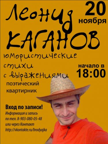 20 ноября (суббота) состоится встреча-квартирник с писателем Леонидом Кагановым. В программе чтение стихов с выражением, иногда с матом (из песни слово не выкинешь — рифма рассыпется), рассказ историй, ответы на вопросы, для желающих, автограф-сессия на заранее принесенных с собой книгах и прочих подходящих поверхностях, ну, и просто приятный вечер в хорошей компании.