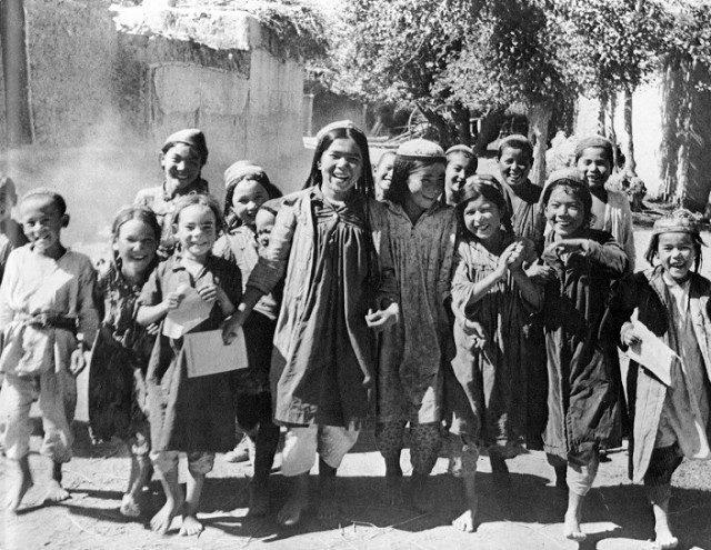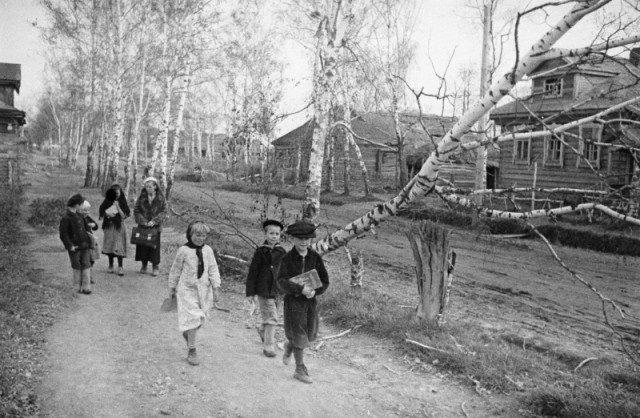 Дети идут в школу по улице освобожденного села. 1942-1943