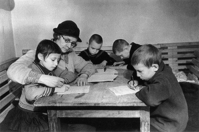 Дети за партами разрушенной школы в Сталинграде. Весна 1943