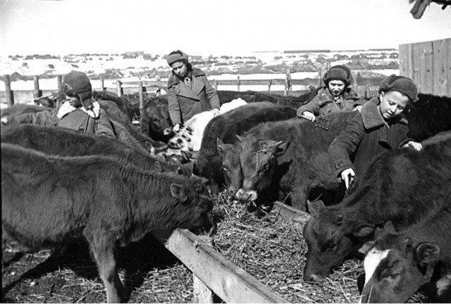 Школьники ухаживают за телятами. Колхоз «Гигант». Пензенская область. 1942
