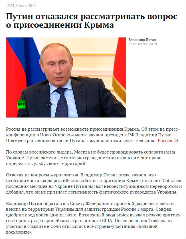 Путин отказался рассматривать вопрос о присоединении Крыма. Россия не рассматривает возможность присоединения Крыма. Об этом на пресс-конференции в Ново-Огарево 4 марта заявил президент РФ Владимир Путин. 04.03.2014г.