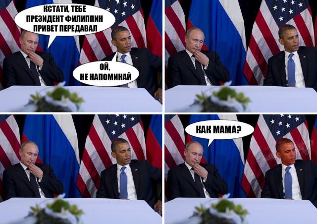 Президент Обама на совместной пресс-конференции с российским президентом Путиным внезапно выпалил: «Все здесь считают, что вы — придурок».«Слышь, я говорю не только о Сноудене и Сирии, — сказал Обама. — Что насчет Пусси Райот? Твоих законов против гомосексуалистов? Абсолютно придурошные поступки, мой друг». Все на мероприятии казалось были поражены нехарактерным для г-на Обамы всплеском эмоций, который затем выдал десятиминутную тираду президенту России, стоявшему с каменным лицом. Когда Путин прищурил глаза и повисла мертвая тишина, Обама еще больше разошелся. «Если ты считаешь, что только я так думаю, то не обольщайся, — сказал Обама, тыкая пальцем чуть не в лицо Путину. — Спроси вот Ангелу Меркель. Спроси Дэвида Камерона. Спроси того турецкого чувака. Да, все они считают, что ты — просто тупица (you’re a dick)». Вскоре после неистового представления Обамы, Путин в немногословном официальном заявлении сказал следующее: «И что, я должен бояться этого тощего? Я на медведях тренируюсь бороться». "Сатирическая колонка."