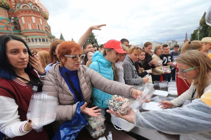 В марте прошлого года тюменцам бросали сосиски, а они ловили. В июне 2016-го Нижнекамск, где праздновали Сабантуй, отличился "бойней за чак-чак" — произошла потасовка во время раздачи восточного лакомства. Третьего сентября в Воронеже, на юбилее города не в меру азартно делили огромный пряник. А четвёртого сентября москвичи и гости столицы откушали салат из кузова самосвала на Красной площади…