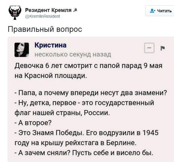 Остальное можно не перечислять как второстепенное... Особое СПАСИБО расеянским либерастам и лично Вове Путину за то, что празднуют свою Победу под стягами предателей-власовцев без всякого стеснения жалких остатков советских людей...