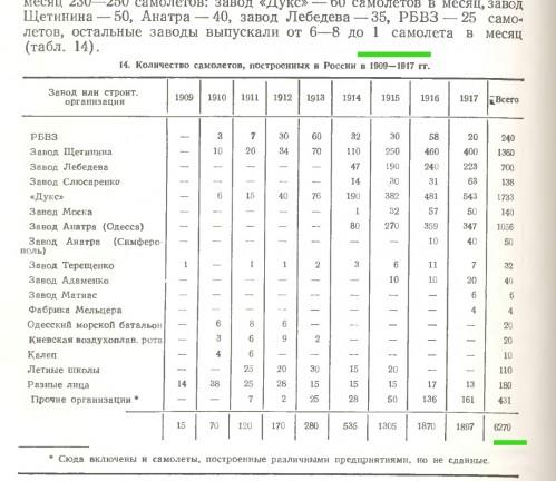 В той же таблице - видно, сколько в реальности был относительно крупных предприятий, строивших авиатехнику. Опять-таки, ни о каких "свыше 20" и речи нету. Если не считать то, что было собрано "на коленке" в воздухоплавательных ротах и частных сараях.