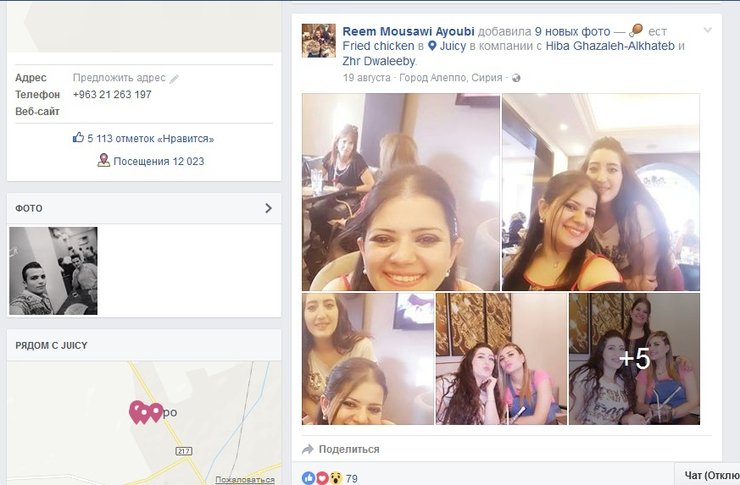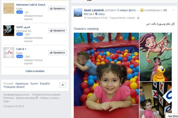 А это фейсбук (в Алеппо-Халебе более 100 тысяч пользователей ФБ), сканы. Хотите - общайтесь с жителями Алеппо, хотите - листайте профили жителей, ресторанов, магазинов, компаний...