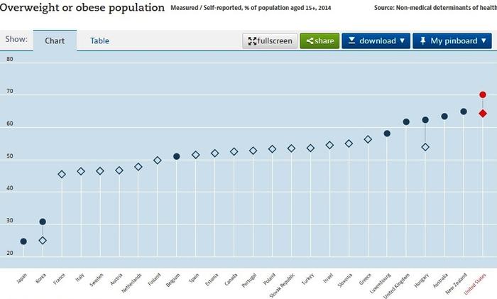 Данные OECD (международная экономическая организация развитых стран) об избыточном весе или ожирении населения (по странам): Overweight or obese population.