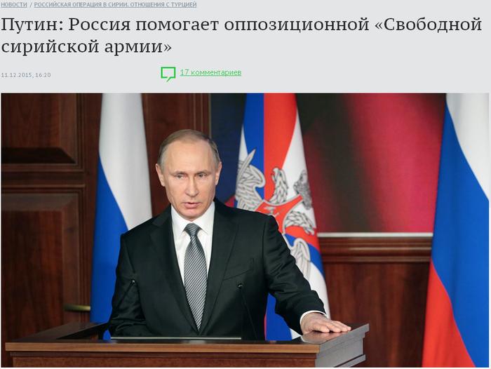 Цитата "Особо отмечу, что работа нашей авиагруппы способствует объединению усилий как правительственных войск, так и Сирийской свободной армии. Сейчас несколько её частей общей численностью свыше пяти тысяч человек, так же как и регулярные войска, ведут наступательные действия против террористов в провинциях Хомс, Хама, Алеппо и Ракка. Кроме этого мы поддерживаем их с воздуха, так же как и сирийскую армию, оказывая им помощь в вооружении, боеприпасах и материальных средствах."