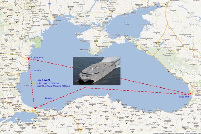 Кроме того, спустя 3 года после принуждения Грузии к миру (08.08.08г.), HSV-2 Swift отметился в грузинском порту Поти 28 марта 2012 года, а уже на утро 30 марта корабль пришвартовался в порту румынского города Констанца.