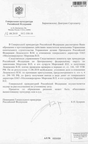 Из той же оперы: Что с деньгами? - Он с ними ушел. Это один из самых курьезных моментов в этом деле. Менты берут под расписку у В. Морозова несколько миллионов рублей для проведения следственного эксперимента в отношении Лещевского. Затем отпускают Лещевского вместе с деньгами.На вопрос что с деньгами, так и отвечают: "он ушел с ними". Уже год деньги вернуть не могут. Приходится писать Нургалиеву:Министру внутренних делРоссийской ФедерацииНургалиеву Р.Г. Уважаемый Рашид Гумарович! В мае 2009 года я, Председатель Правления ОАО «Москонверспром» Морозов Валерий Павлович, обратился в ОРБ № 7 ДЭБ МВД РФ с заявлением о вымогательстве и коррупционном давлении со стороны сотрудников Управления делами Президента РФ, в частности, заместителя Главного управления капитального строительства УДП РФ В.М.Лещевского. На встрече с начальником 5 отдела