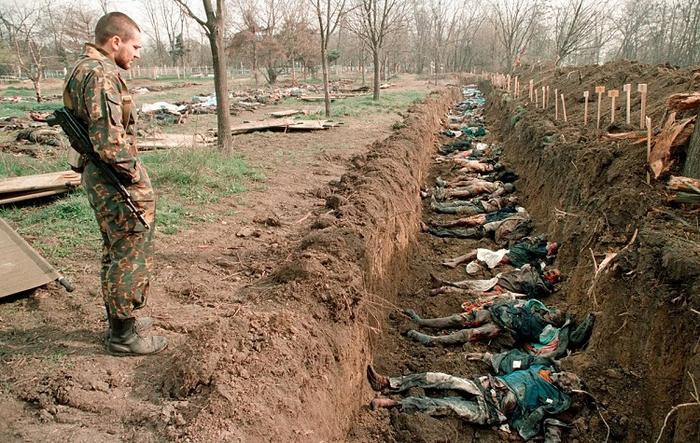 Чеченцы своих захоронили,а Грач для русских вырыл общую могилу рядом с русским кладбищем. Вата внимательно смотри фото, там видны надгробные кресты рядом .