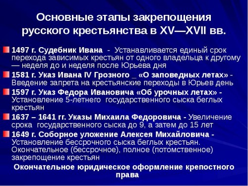 В царской России крепостничество широко распространилось к XVI веку; официально подтверждено Соборным уложением от 1649 года; отменено в 1861 году.