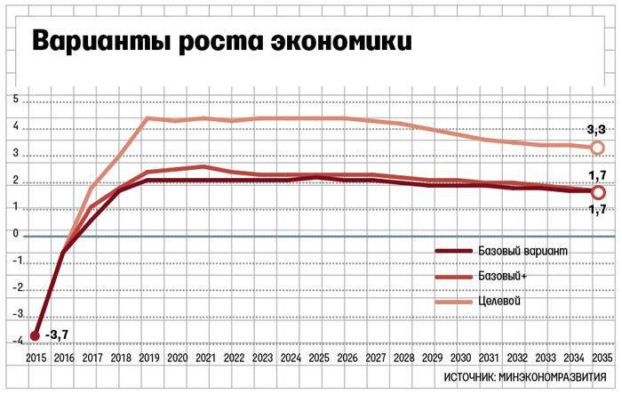 Вариант с реформами – в третьем, целевом сценарии прогноза Минэкономразвития. Цена нефти в нем такая же, как в «базовом плюс», примерно такие же и демографические параметры. Но более быстрый рост внутренних инвестиций сопровождается более высокой (в отличие от других двух вариантов) производительностью труда, более быстрым ростом доходов населения. Текущий счет платежного баланса постепенно уходит в дефицит за счет опережающего роста импорта; однако это компенсируется чистым притоком капитала с 2020 г. Рост экономики ускоряется до более 4% уже в 2019 г. и остается выше среднемирового: в среднем – 3,6% в год за 2016–2035 гг.