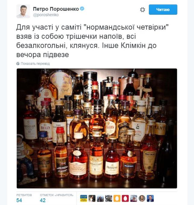 "Принижая соперника, врага,..." - на таких встречах всем ставят одинаковые приборы и наливают спиртное, даже если человек не пьет, - этим показывают равенство партнеров, уважение А здесь организаторы, - Германия, считай, меркель, - не поставили бокал Поросе, - этим его "опустили ниже плинтуса"! Как минимум, это сигнал на весь мир, что Нормандская далеко не четверка, а как бы ТРОЙКА.