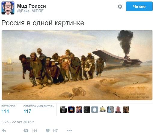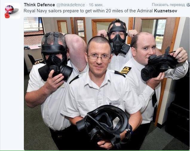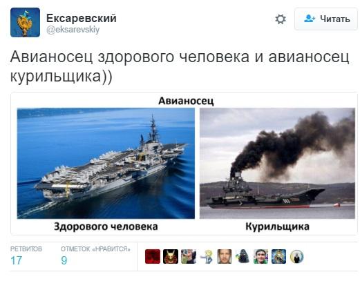 Совсем другая интонация у публикации британской газеты The Telegraph: обозреватели отмечают, что "Кузнецов" был поднят на смех в соцсетях из-за характерного для броненосцев начала 20-го века шлейфа черного дыма, сопровождающего авианосец на марше.