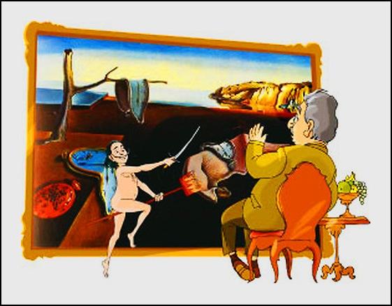 А часы бьют четыре раза, и с последним ударом врубается из скрытых динамиков с оглушительным звоном «Танец с саблями»! Дверь с громом распахивается – и влетает верхом на швабре совершенно голый Дали, маша над головой саблей!