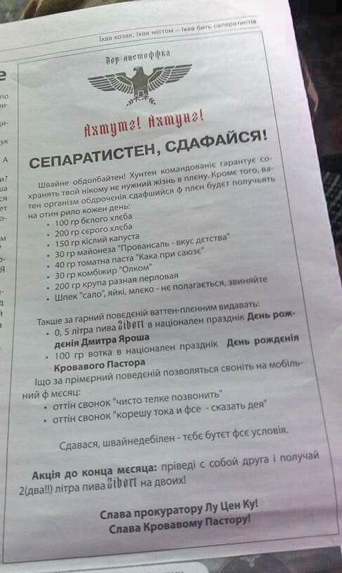 Вчера ездил в Музей Новороссии, где состоялась торжественная передача папахи погибшего Моторолы. Там же мне дали вот такую интересную штуку - методичку по поведению в "зоне АТО", которую ВСУ разбрасывали в некоторых точках на Донбассе. Выглядит она так: