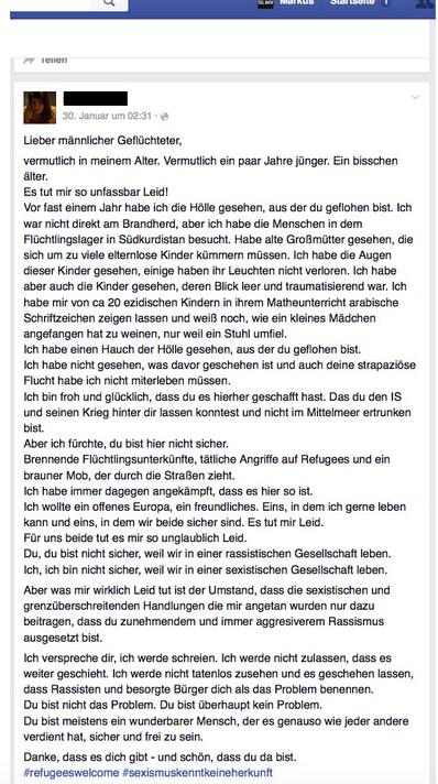 По-настоящему сильным, как мне кажется, аргументом в пользу новоприбывших мигрантов стало бы, если бы каждая из шестисот изнасилованных немецких женщин, которые подали заявления в полицию с жалобами, опубликовали бы благодарности и выразили восторг по поводу случившегося