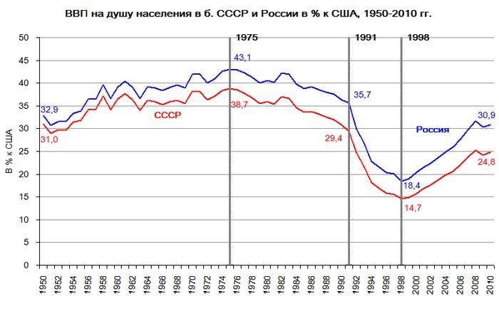 К примеру, размер путинского ВВП на душу населения остается ниже уровня РСФСР 1950 годов. Т.е ВВП россиян сегодня на уровне 1949года РСФСР