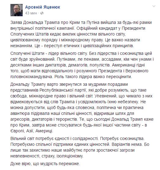 "Официальный кандидат в президенты Соединенных Штатов бросает вызов ценностям свободного мира, цивилизованного порядка и международного права. Это тяжело назвать незнанием. Это – преступление этических и цивилизационных принципов.