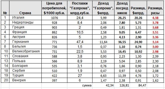 Наглее всего цены накручивают в Западной Европе (Италия, Нидерланды, Франция, Австрия, Германия, Бельгия, Великобритания и примкнувшая к ним Греция). И если «Газпром» от поставок в Западную Европу получает чуть меньше 30 млрд., то посредники имеют уже больше 100 млрд., т.е. почти 350%.