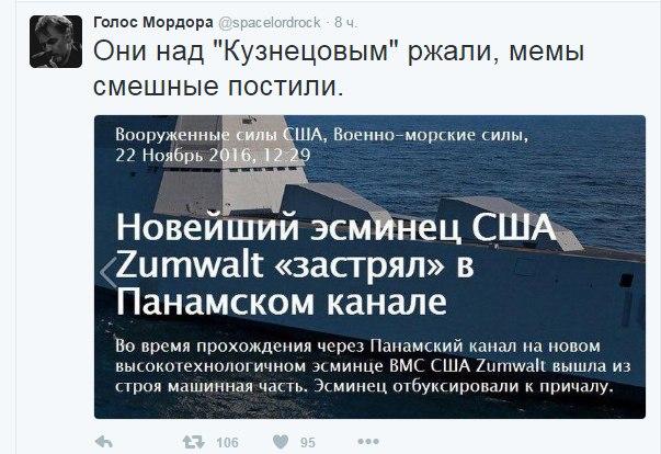 А вчера распиаренный новейший высокотехнологичный американский эсминец Zumwalt крякнул, захлебнувшись водой в Панамском канале. Оттащили на базу. А Замволту всего три года.