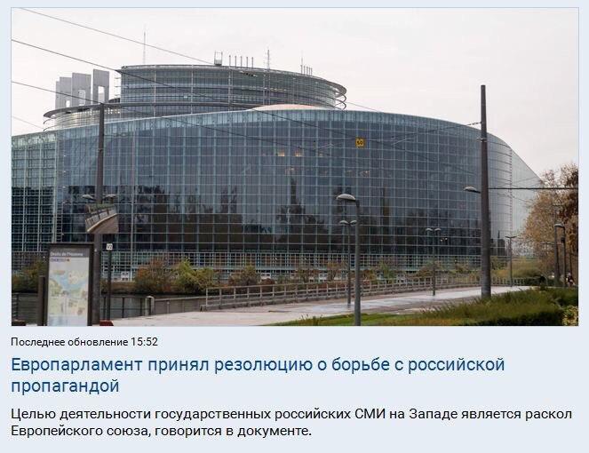 В среду Европарламент принял резолюцию под названием "Стратегические коммуникации ЕС как противодействие пропаганде третьих сторон". В документе, ряд положений которого граничит с предложением ввести цензуру в отношении российских СМИ, утверждается, что Россия якобы оказывает финансовую поддержку оппозиционным политическим партиям и организациям в странах-членах ЕС, использует фактор двусторонних межгосударственных отношений для разобщения членов сообщества. В качестве основных информационных угроз Евросоюзу и его партнерам в Восточной Европе в резолюции называются агентство Sputnik, телеканал RT, фонд "Русский мир" и подведомственное российскому МИД федеральное агентство "Россотрудничество".