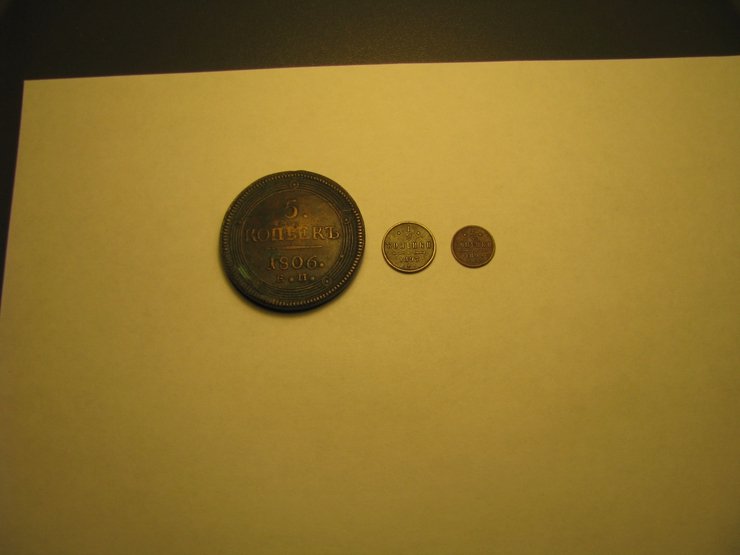 это для сравнения пять копеек Александра 1, полушка Николая 2 и четвертинка Николая 2