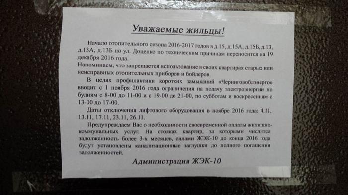 Долго ждал момента, когда наши ЖЭКи начнут наклеивать тревожные объявления на наши облезлые подъездные двери. Даже закралась мысль, что эта зима пройдет гладко, без проблем с отоплением, горячей водой и электричеством. Но нет, чуда не произошло!