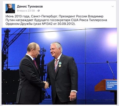 Стоит напомнить, что три года назад Владимир Путин наградил главу ExxonMobil Рекса Тиллерсона Орденом Дружбы за "значительный вклад в укрепление сотрудничества в топливно-энергетическом секторе".