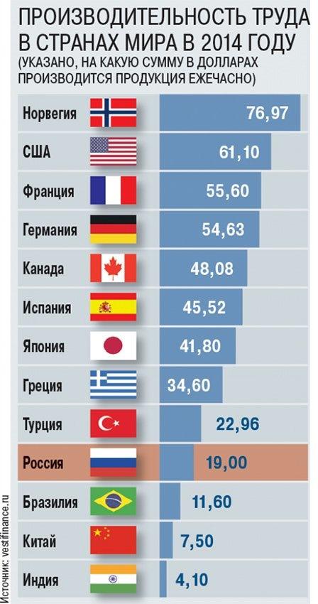меньше чем в Германии в 2,88раза, меньше чем в Японии в 2,2раза... Даже в Турции работают в 1,2 раза лучше чем в России