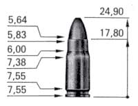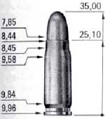 Так, диаметр пули патрона 9х18мм ПМ равен 9.2мм, патрона 7.62х39мм - 7.85мм. В большинстве западных стран (США, Европа) калибр измеряют по долам нарезов, поэтому, например, фактический диаметр пули патрона 9мм Парабеллум равен 9.02 мм.