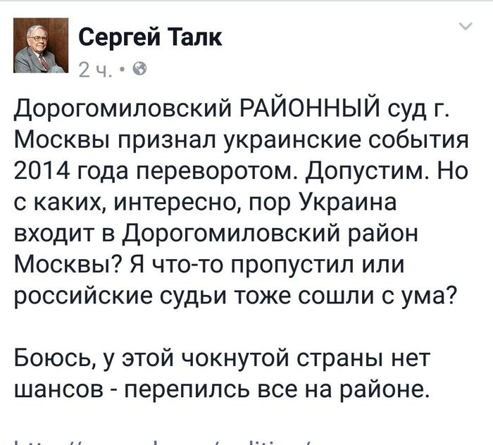Дорогомиловский суд Москвы признал события на Украине в феврале 2014 года государственным переворотом. Беглый президент Украины Виктор Янукович и его соратники дали убедительные безальтернативные показания, из которых вышло, что во всем они невиновны, а виновна страна, которая выбрала Порошенко, а не Януковича. В общем, Украину признали виновной в том, что ей не понравилось, что ее лучших сынов и дочерей вначале избивали, а потом расстреливали. Украина должна была потерпеть пару лет это над собой насилие.
